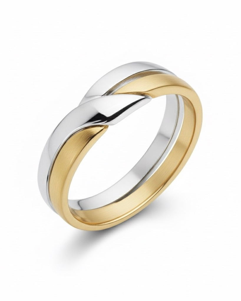 Graceful and contemporary, this women’s wedding ring is crafted in 18K yellow and white gold, featuring elegantly interconnected bands that symbolise unity, harmony, and lasting connection. The interplay of warm and cool tones creates a refined, balanced aesthetic — timeless yet distinctly modern.