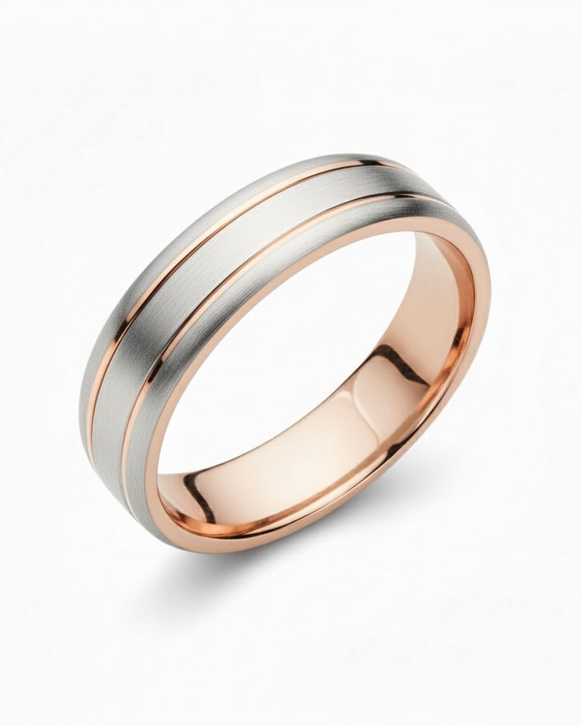 Bold yet understated, this men’s wedding ring is crafted in brushed 18K white gold and accented with a polished rose gold interior for a refined contrast. The interplay of textures and tones creates a distinctive, contemporary aesthetic — balancing strength with subtle sophistication.